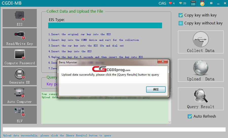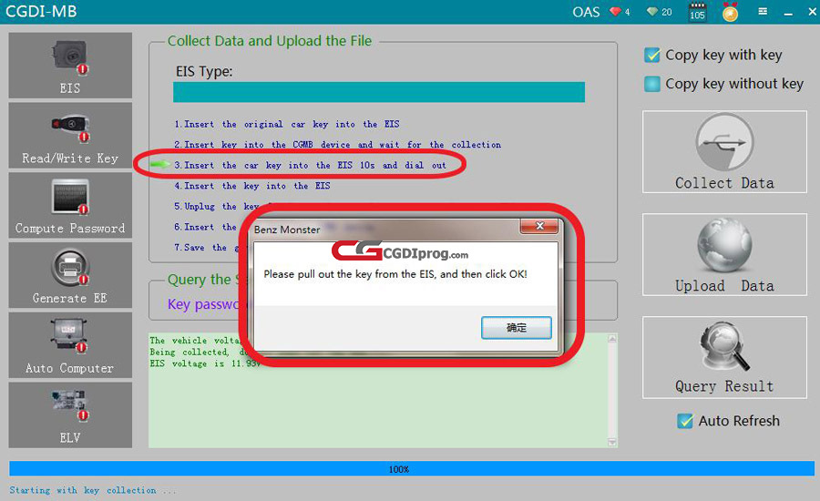Next, insert the key into the EIS and click "OK." Then, insert the same key into the CGDI MB device and click "OK."